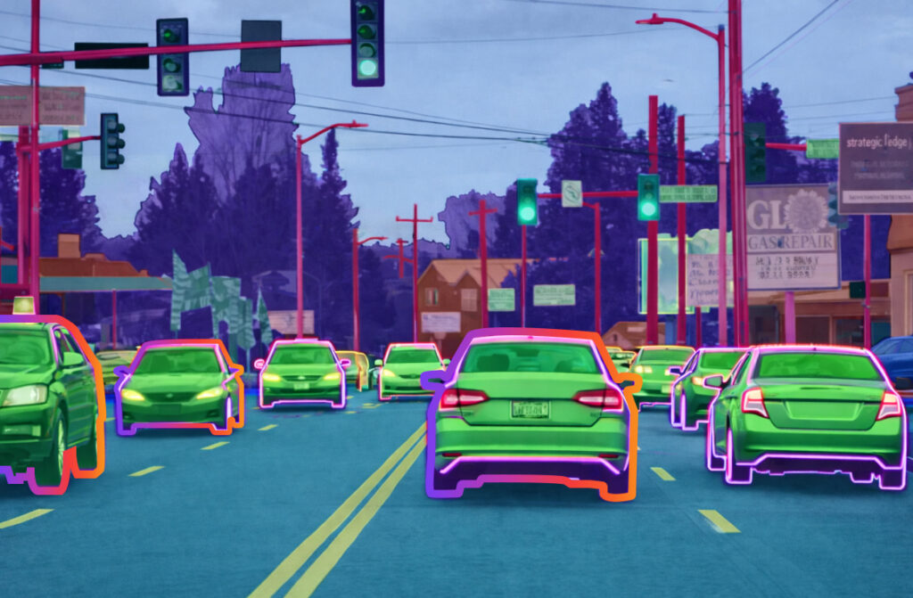 Semantic segmentation labels every pixel in an image with a class, allowing the model to understand different regions. All objects of the same class are treated as one group, without distinguishing individual instances. This technique provides a deeper understanding of image context and structure. It is especially useful when area coverage matters more than object count. Annotation is more detailed and time-intensive.