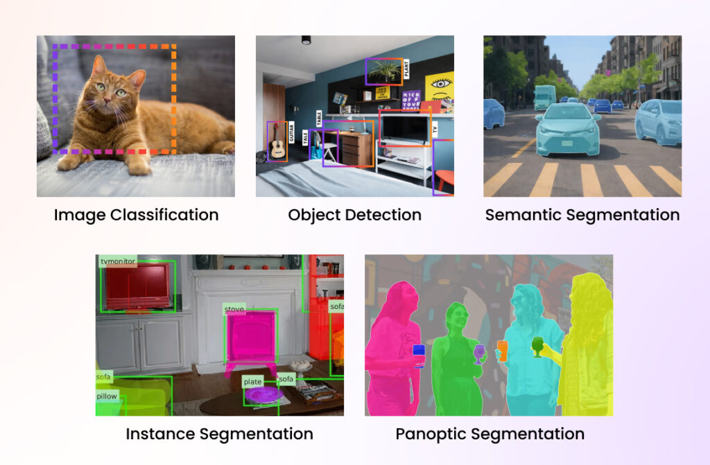 Panoptic segmentation unifies semantic and instance segmentation into a single framework. It labels every pixel in the image while also distinguishing individual object instances where applicable. This technique provides a complete scene understanding, combining background context and object-level details. It is commonly used in advanced computer vision systems. Panoptic segmentation requires high-quality annotation and strong computational resources.